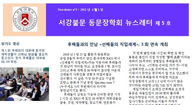 불문과 동문회(회장 85 도광환)에서 제작하고 있는 '서강불문 동문장학회 뉴스레터' 제5호가 발행됐습니다. 이번호에는 불문과 동문회가 진행하고 있는 '선배들의 직업세계' 행사 소식과, 창과 30주년 기념식을 준비하고 있다는 소식 등이 실렸습니다.