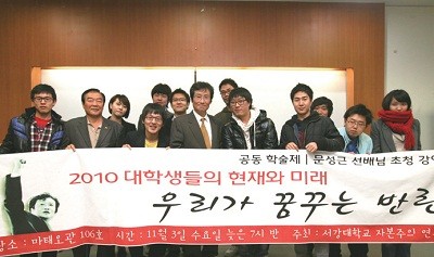 문성근(72 무역) 동문이 11월 4일 마태오관 106호에서 ‘대학생, 반란을 꿈꾸다’라는 주제로 특강했다. ‘2010 서강대학교 연합학술제’ 행사 프로그램 가운데 하나로 ‘자본주의 연구회’가 주최한 이번 특강에는 재학생과 타 대학 학생 등 50여 명이 참석했다.