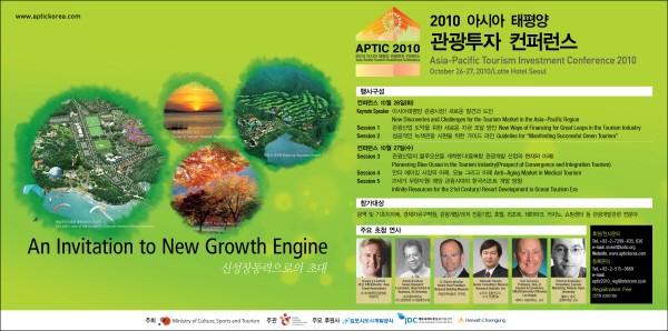 한국관광공사 투자지원팀에 재직 중인 강철(87 불문) 동문이 총괄하는 ‘2010 아시아 태평양 관광투자 컨퍼런스’가 10월 26일부터 27일까지 서울 소공동에 위치한 롯데호텔 에서 열립니다. ‘신 성장 동력으로의 초대(An Invitation to New Growth Engine)’라는 주제로 진행되는 이번 컨퍼런스는 국내 유일의 관광개발 및 투자부문 전문행사로, 관광개발과 관련된 분야의 종사자라면 누구든지 참여할 수 있습니다.