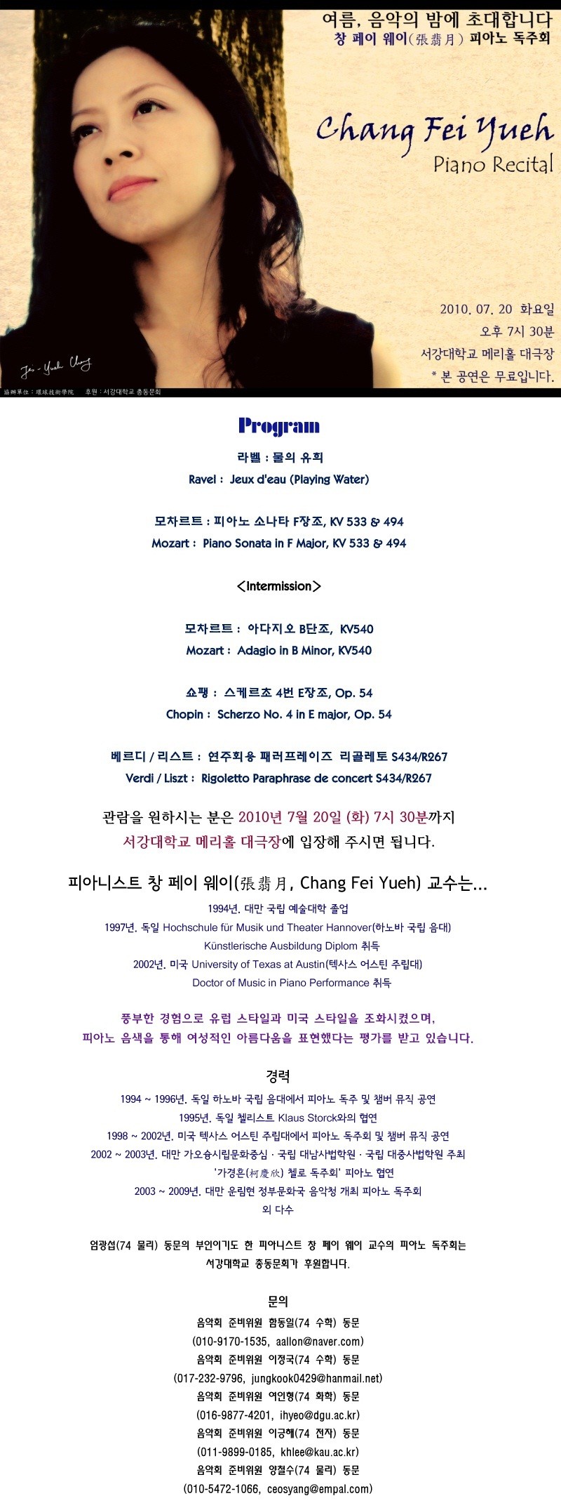 엄광섭(74 물리) 동문의 부인인 창 페이 웨이 교수의 피아노 독주회가 7월 20일 화요일 오후 7시 30분 서강대학교 메리홀 대극장에서 열립니다.