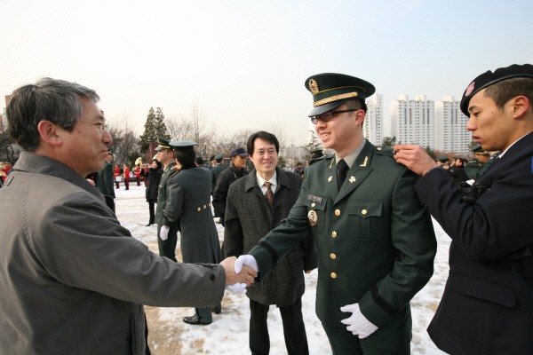 송영만 부회장은 우수한 성적으로 졸업하게 된 김현수(05 화공생명공학) 후보생에게 총동문회장 상장과 부상으로 준비한 시계를 선물했습니다. 이어 “2009년 자랑스런 서강인상을 받은 김태영(73 독문) 국방장관이 ‘서강에서 배운 인문학이 군 생활에 큰 도움이 됐다’는 수상소감을 밝힌 바 있다”면서 “4년간 서강에서 배운 학문적 열정을 토대로 ROTC 출신들이 보여줄 수 있는 창의적인 리더십을 마음껏 발휘해 부대를 통솔하는 ‘창의적인 지휘관’이 돼 달라”고 말했습니다.