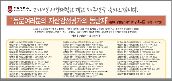 문경필(89 생명), 곽대호(97 경영), 서정석(98 경영), 정재우(03 경제) 동문 등은 2009년 제 20회 감정평가사 시험에 최종 합격하고 서강감정평가사회(회장 71 수학 최재규) 신입 회원이 됐습니다.