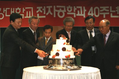 전자공학과 40주년 행사에서 정창진 전자공학과 동문회장, 안철 명예교수, 김용민 기념사업 추진위원장, 이종욱 총장, 유기풍 산학부총장, 장익수 명예교수(사진 왼쪽부터) 등이 케익커팅을 하고 있다.