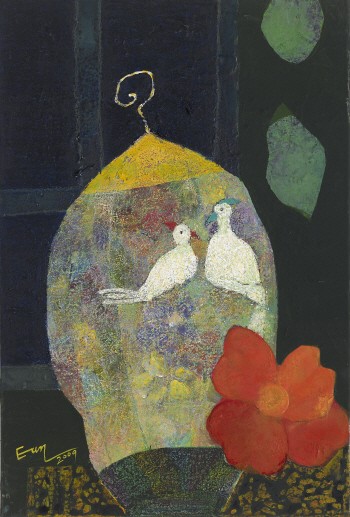 깜깜한 밤 창가에 새장이 하나 있습니다. 그 안엔 예쁜 새 한 쌍이 있네요. 갇혀있음에도 불구하고 그들이 가여워 보이지 않는 것은 서로 무척 사랑하고 의지하는 것처럼 느껴지기 때문이 아닐까요? 그들의 충만한 사랑을 새장 속 가득 꽃으로 표현해 보았습니다