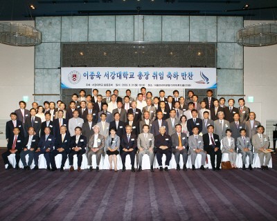 <이종욱 총장 취임 축하 만찬에 참석한 역대 총동문회장, 총동문회 이사와 감사, 특수/전문대학원 동문회 임원, 학과별/직능별/동아리별 동문회 임원 등이 신임 보직 교수들과 기념촬영을 했다. ‘특별한 서강’프로젝트 완수를 위한 서강가족 모두의 큰걸음이 시작되는 순간이었다.>