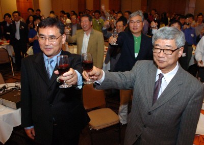 <나재순(69 무역, 사진 왼쪽) 동문이 창립 총회에서 임문일(70 신방, 사진 오른쪽) 동문과 함께 건배하고 있다.>