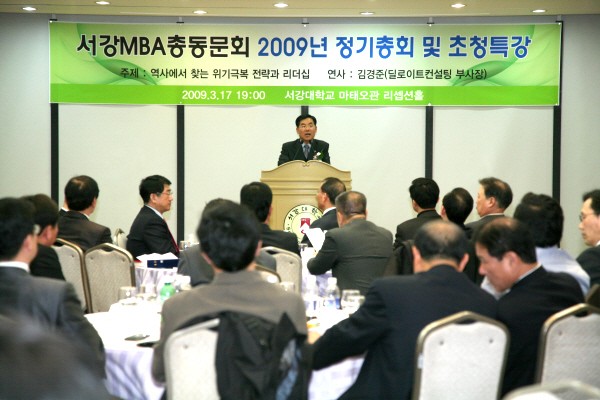 모교 경영전문대학원(이하 MBA) 동문회는 3월 17일 모교 마태오관 9층 리셉션 홀에서 '2009년 정기총회 및 세미나'를 개최했다. 이날 행사에는 최운열 부총장을 비롯한 임채운 경영전문대학원장과 교수, 홍재영 회장을 비롯한 MBA 역대 회장들이 참석하였으며, MBA 행사라면 항상 적극적으로 참여하는 동문들이 행사장을 가득 메웠다.