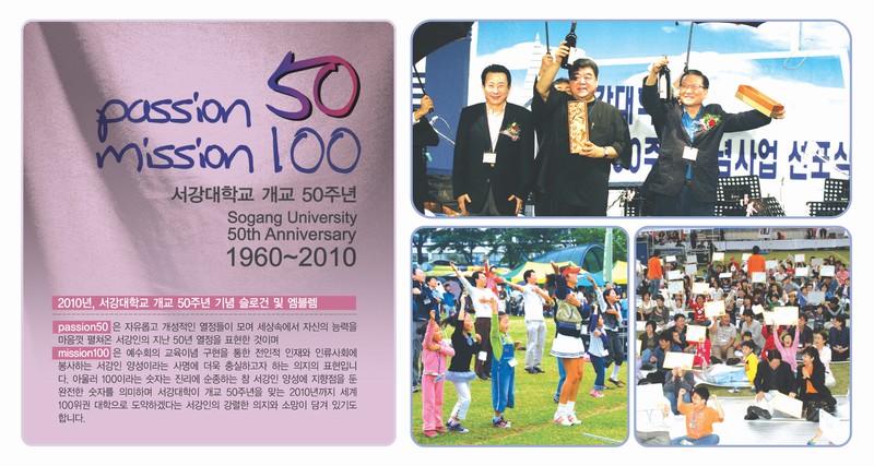 기념사업 선포식의 대미는 개교 50주년 엠블렘과 슬로건 공개로 장식되었다. 폭죽과 함께“Passion 50, Mission100”이라고 쓰인 대형 배너가 무대에 공개되자 커다란 박수와 환호가 터져 나왔다. 이번에 선정된 개교 50주년 엠블렘과 슬로건인“Passion 50, Mission 100”에는 2010년까지 세계 100위권 대학으로 도약하겠다는 의지를 담은 것이다. <상단그림참고>