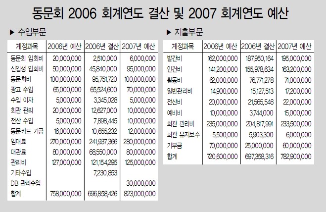 (▲ 동문회와 장학회의 2006년도 사업 예·결산 표와 2007년도 사업 예산은 위와 같다. <표> )
