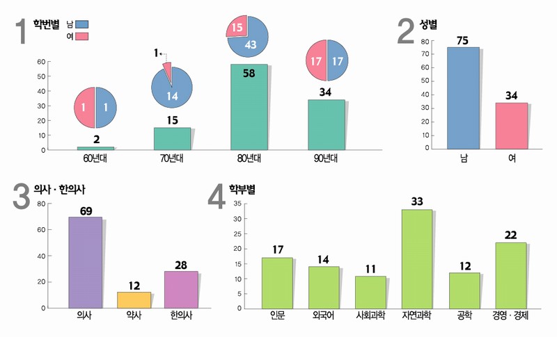 의대의 경우 서강 졸업후 편입하거나 재입학을 했고, 한의사가 된 이들은 모두 다른 대학 한의과 대학을 다시 다닌 경우가 많았다. 모교 졸업까지 재학기간을 보면 남자 동문의 경우 평균적으로 7년이 가장 많았고 10년을 넘게 다닌‘장수생' 들도간혹 있었다. 여자 동문의 경우 4년이 압도적으로 많아 진로 전향에 발빠르게 대처한 것으로 파악되었다. 학번대별로살펴보면 80년대 학번 의료인이 58명으로 가장 많았고, 비교적 최근에 졸업한 90년대 학번이 34명으로 그 뒤를 이었다. 최근 각종 고시에 여풍이 거센 것과 같이 의료계에 진출하는 여자 동문들의 숫자는 80년대부터 계속 늘어나고 있다.