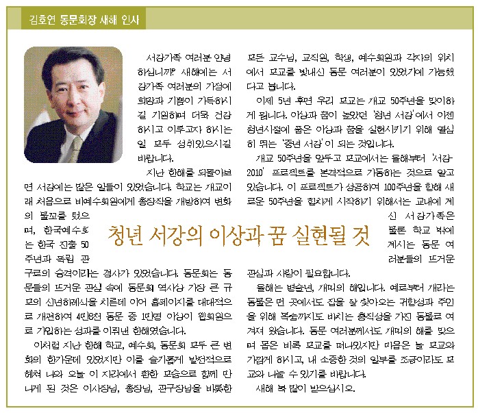 서강대학교 동문회 2006년 신년하례식이 서울 삼성동 그랜드인터컨티넨탈호텔에서 열렸습니다. 모두들 밝은 얼굴로 새해 덕담을 주고받았습니다. 모든 동문이 참석하지는 못했지만, ‘내 생애 가장 소중한 만남’ 이 한마디에 공감하는 분위기는 서강인 모두에게 전달됐을 겁니다. 행사 후 돌아가는 길에는 하늘에서 곱게 눈이 내려, 올 한 해 동문들과 서강의 앞길을 밝게 열어주는 것 같았지요. 신년하례식 분위기를 문답풀이 형식으로 지면을 통해 전합니다.