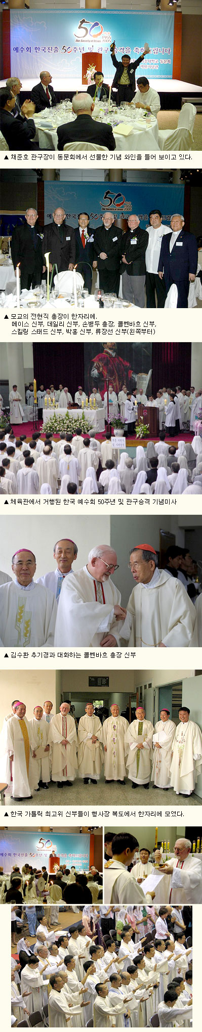 모교를 설립하고 다양한 사도직을 통해 한국사회에 많은 영향을 끼쳐온 예수회가 올해로 한국진출 50주년을 맞았다.이와 함께 9월1일자로 관구(초대관구장 채준호 신부)로 승격된 한국예수회는 겹경사를 맞았다. 이를 기념하여 예수회 한국 관구는 9월1일 모교에서 큰잔치를 열었다. 기념행사는 오후 2시 이냐시오 소강당에서 ‘활동중의 관상' 을주제로 한 심종혁 신부와 송봉모 신부의 영성강연회로 시작됐다. 500석 규모의 강연장에는 빈틈이 없었다.