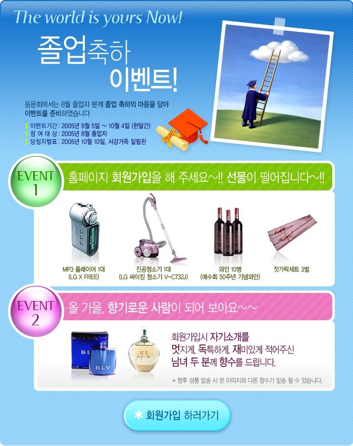 한편 동문회 홈페이지는 가을을 맞아 메인화면을 새롭게 하고 8월 졸업자들을대상으로 10월 5일까지졸업 축하 회원가입이벤트를 진행중이다. 이벤트 기간내에 회원가입한 동문들, 멋진 자기소개를 남긴 동문들을 위한 푸짐한 선물이 마련되어있다.