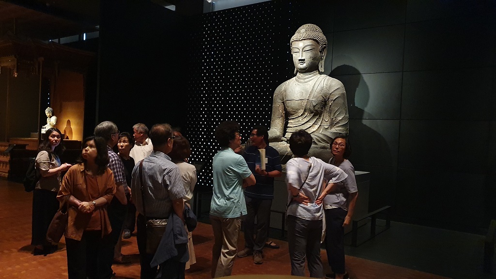 참가자들은 먼저 10월 20일까지 특별 전시 중인 ‘공주 마곡사 괘불’을 관람했습니다. 박 동문은 “절의 큰 의식 때 쓰이는 괘불은 큰 크기에서도 알 수 있듯 부처님을 존경하는 마음을 담고 있다”라며 “2층과 3층, 보는 위치에 따라 사람들이 느끼는 정서가 달라진다”라고 소개했습니다. 이어 박 동문은 3층 불교조각실에서 시대와 지역별로 불상의 모습이 다르게 형성된다고 설명한 다음, 불상에 나타나는 깨달은 자의 특징을 소개했습니다.
