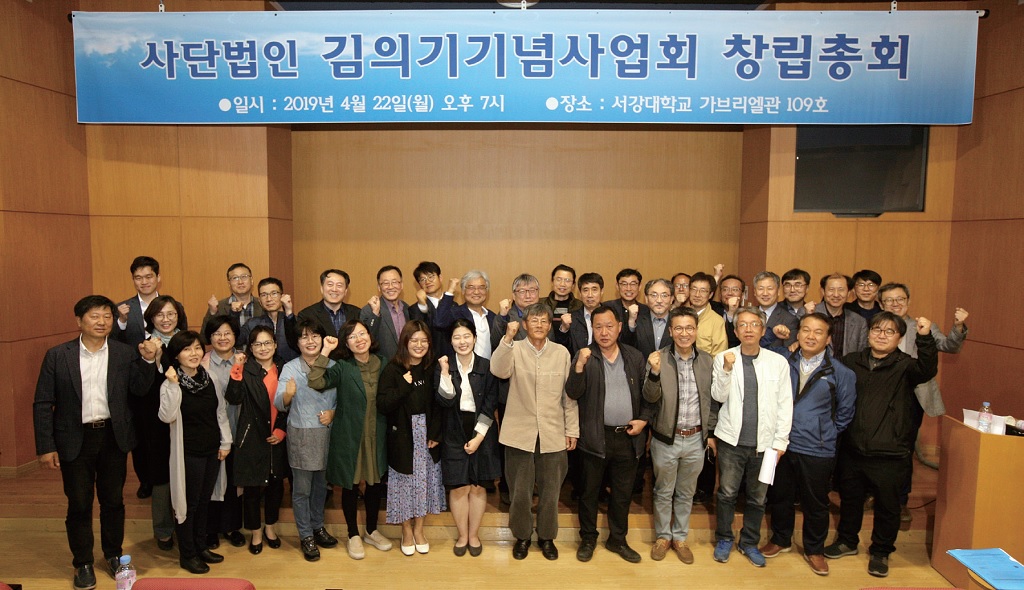 (사)김의기기념사업회 추진위원회(위원장 78 경제 윤종화)는 4월 22일 가브리엘관 109호에서 35명의 회원이 참석한 가운데 창립총회를 열어 △정관 승인 △사업계획 및 예산안 확정 △재산 출연사항과 사무실 마련(동문회관 206호) 보고를 마치고 임기 2년의 부회장, 이사, 감사와 고문단을 뽑았습니다.