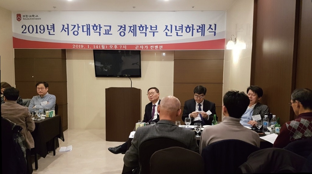 경제학부 동문회(회장 81 김길수) 2019년 신년하례식이 1월 14일 오후 6시 30분 모교 곤자가홀에서 열렸습니다. 41명이 참석해 평소 보다 규모가 작았지만 김길수(81) 회장을 비롯해 정재식(80) 모교 경제학과 교수, 홍재식(81) 부회장, 이철순(82) 동문 등 80년대 초반 학번이 적극 참여했기에 열기는 뜨거웠습니다.