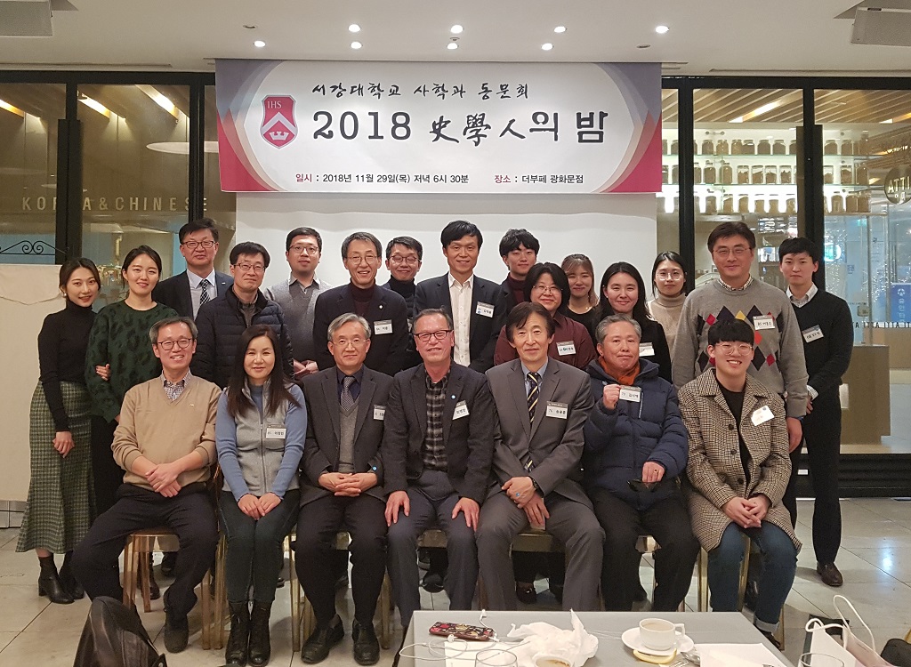 사학과 동문회(회장 76 송용훈)가 11월 29일 저녁 7시 종로 더부페에서 ‘2018 사학인의 밤’ 행사를 개최했습니다. 18명이 참석한 가운데 행사 사회는 최윤식(85) 동문이 맡았습니다. 송용훈(76) 동문회장은 “1년에 한 번 건강한 모습으로 만날 수 있는 인연이 소중하다”라며 “오늘 행사에 참석한 선후배들이 서로 많은 이야기 나누는 즐거운 자리가 되길 바라고, 내년에도 기운 내고 건강하게 지내자”라고 인사했습니다.