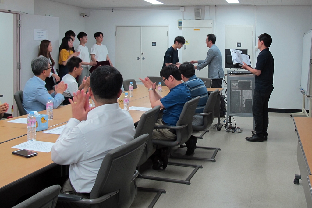 화공생명공학과 2018 년도 1학기 장학증서 수여식이 6월 4일 오후 12시 학과 회의실인 R관 521A호에서 열렸습니다. 교수, 재학생 등이 참석한 가운데 강태욱 학과장은 윤석환(13), 김중표(14), 서승환(14) 장학생에게 ‘화공사랑 릴레이 장학금’을 전달했습니다.