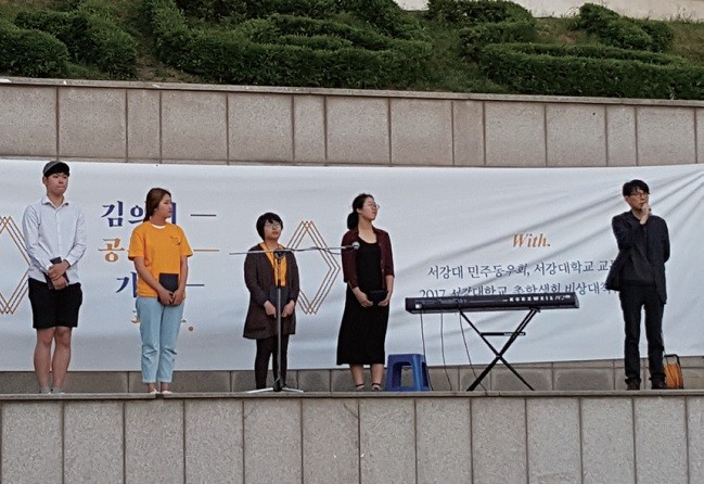 ‘김의기 선배를 기억하는 동문 장학모임’은 2017년 1학기 ‘김의기 장학생’ 4명을 선정해 150만원씩 600만원을 장학금으로 전달했습니다. 5월 25일 열린 제37주기 의기제 문화공연장에서 최재영(90 경영) 동문은 장학모임 대표로 참석해 김우린(15 사회), 김의령(16 사학), 김초원(16 철학), 이준혁(16 중국문화) 장학생에게 장학증서를 전달하고 격려했습니다. 이날 김의기(76 무역) 열사의 유가족 김의숙, 김주숙 두 누나가 참석해 커다란 박수로 축하했습니다.
