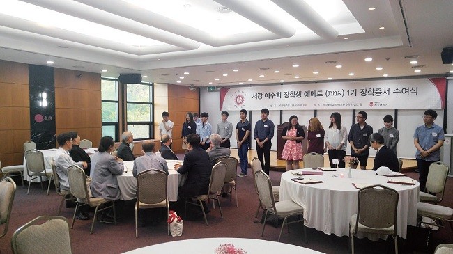 학교법인 서강대학교(이하 법인)가 6월 1일 오후 6시 모교 마태오관 9층 리셉션 홀에서 ‘서강 예수회 공동체 장학금 장학생 에메트 1기 장학증서 수여식’을 개최했습니다. 수여식에는 김정택(71 철학) 이사장과 정강엽(82 경영) 상임이사, 윤병남(75 사학) 교학부총장, 김용해(석사 88 철학) 교목처장 등 법인 및 학교 관계자가 참석해 장학생으로 선발된 재학생 12명을 격려했습니다.