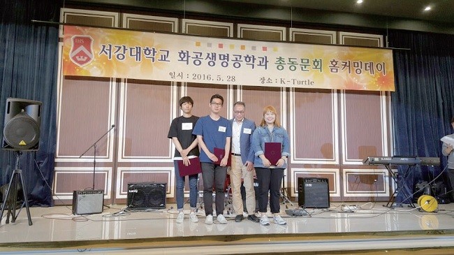 ‘화공사랑 릴레이 장학금’ 장학증서 수여식이 5월 28일 오후 6시 거구장에서 열렸습니다. ‘화공생명학과 동문회 홈커밍데이’ 행사를 겸한 장학증서 수여식에서 장성훈(76) 화공생명공학과 발전위원회 회장은 김종민(11 화공), 임종표(12 화공), 정연이(14 화공), 서경준(석사 15 화공) 장학생에게 증서를 전달했습니다. 장학생들은 장학금으로 대학원생 150만원, 학부생 100만원씩 지원받았습니다. ‘화공사랑 릴레이 장학금’은 2014년 화공생명공학과 발전위원회 동문들이 후배 사랑하는 마음을 릴레이로 잇고자 하는 마음으로 만들었습니다.