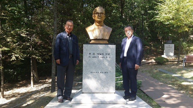 박정철(60 사학) 전(前) 동상 건립 및 장학금 모금 추진위원장과 이한일(60 경제) 동문은 10월 13일 방한 일정을 쪼개 총동문회를 격려차 방문하고, 데일리 신부 동상을 살폈습니다. 데일리 초대총장 신부의 동상은 지난해 7월 도서관 옆 로욜라 동산에 흉상(胸像)으로 건립됐습니다. 미국 거주 동문들과 60년대 학번 동문들이 주축이 된 추진위원회는, 2011년 12월 선종한 고인의 뜻을 기리고자 동상건립과 장학금 모금 캠페인을 벌여 2억여원의 기금을 모았습니다.