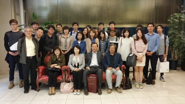 <위 사진 : 'LITE 장학금' 기부자와 장학생들의 두 번째 만남이 성사되었다. 앞줄 왼쪽부터 이광훈(77 신방) 교수, 조숙환(72 영문) 교수, 이인영(74 영문) 기부자, 노상범(73 국문) 기부자, 송효섭(73 국문) 교수>