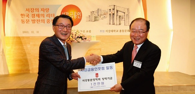 앞서 서강동문장학회는 지난 9월 11일 개최한 장학증서 수여식에서 지난해 조성한 ‘서강금융인포럼 장학금’을 김성만(08 정외), 하영호(08 경영), 김동환(10 기계), 김표체(10 경영), 박명준(10 화학), 유재림(10 종교), 이주희(13 EU문화) 재학생 들에게 전달한 바 있습니다.