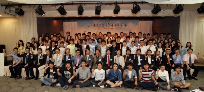 <현대해상 재직동문 장학금 기부자 유원식(89 경제), 김현우(98 경영) 동문과 현대 엔지니어링 재직동문 장학금 기부자 임종우(06 화공) 동문과 장학생들>