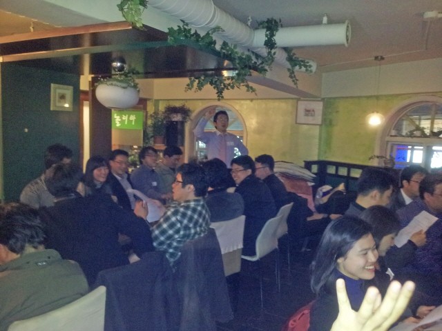 <41명의 동문들이 참여해 성황을 이룬 송년회. 2차 호프집으로 옮겨 안건을 논의하는 모습>