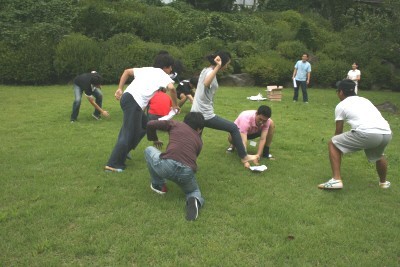 참가자들은 잔디밭에서 친목을 다지는 다양한 레크리에이션에 참여했다. ▲몸짓(제스처)으로 설명하는 속담 알아 맞추기 ▲신문지에 뚫은 구멍에 머리 넣고 달리기(2인조 종이기차 놀이) ▲멀리서 과자 던져 받아먹기 ▲풍선 불어 멀리 날리기 ▲5인조 전차 릴레이 게임 등 다채롭게 진행한 레크리에이션은 참가자들이 마음의 문을 열고 서로 소통하는 밑바탕이 됐다.