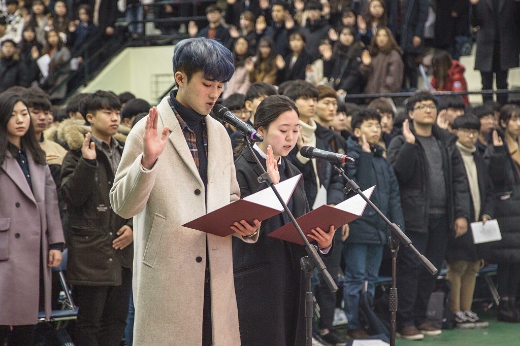 2018학년도 입학식 및 신입생 축복예식이 2월 21일 모교 체육관에서 열렸습니다. 신입생 1902명이 서강 가족으로서의 새 출발을 시작한 입학식은 김진화(81 영문) 입학처장의 신입생 학사보고로 시작했습니다. 이후 신입생 선서, 박종구 총장의 환영사, 보직자 소개, 말씀의 전례, 성찬의 전례, 축가 및 교가 순서로 이어졌습니다. 서민수(커뮤니케이션학과), 조혜리(중국문화학과) 재학생은 신입생 대표로 신입생 선서문을 낭독했습니다.