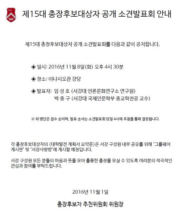 이로써 오는 11월 8일 오후 4시 30분 이냐시오관 강당에서 개최되는 ‘제15대 총장후보대상자 공개소견발표회’에는 박종구 서강대 국제인문학부 종교학전공 교수(예수회 신부)와 임성호(76 신방) 서강대 언론문화연구소 연구원 등 총장후보대상자 2명이 참여할 예정입니다.