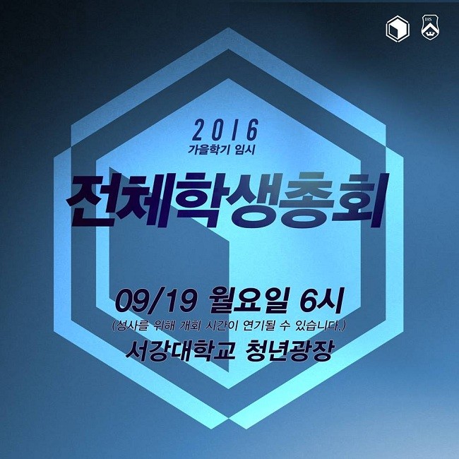 총학생회가 9월 19일 월요일 오후 6시 모교 청년광장에서 임시 전체학생총회를 개최합니다. 이번 총회의 안건은 '이사회 정상화 약속 요구'와 '이를 위한 실력 행사 결의'이며, 이사회 정상화를 위한 구체적 요구 사항은 △법정전입금 완납 △예수회 이사진 비율 개편 △남양주 캠퍼스 사업에 대한 확결 입니다.