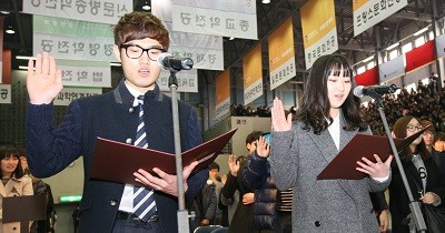 2014학년도 입학식이 2월 20일 오전 9시 30분 모교 체육관에서 열 렸다. 올해 입학한 신입생 1814명을 축복하는 미사 이후 진행한 입학식에서 김정택(71 철학) 이사장은 “얼마 전 예수회 신부님들과 함께 졸업한 동문이 운영하는 훌륭한 회사 두 곳을 탐방했다”라며 “신입생 역시 공동체 정신을 바탕으로 국제 사회 문제를 해결하는 인재가 되길 바란다”라고 말했다. 이어 유기풍(SCAMP 15기) 총장은 “학생을 중심으로 창의력을 높이는 교육을 하겠다”라고 말했다.
