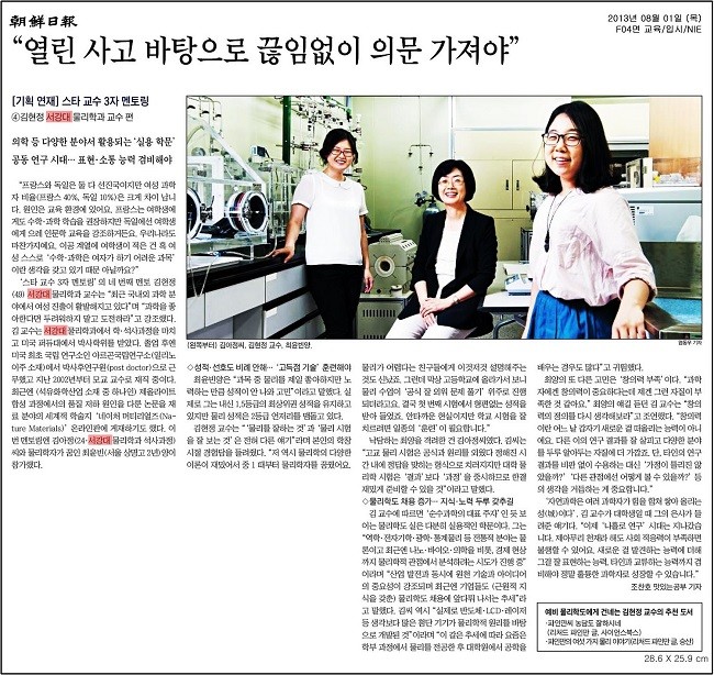 물리학자를 꿈꾸는 학생에게 보내는 김현정(83 물리) 모교 물리학과 교수의 메시지가 조선일보에 실렸습니다. 김 교수는 "최근 국내외 과학 분야에서 여성 진출이 활발해지고 있다"라며 "과학을 좋아한다면 두려워하지 말고 도전하라"라고 조언했습니다.
