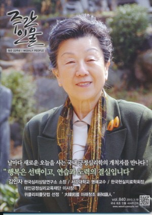 김인자 명예교수가 인물 시사주간지 ‘주간인물’ 840호(3월 19일 발간) 커버 스토리에 소개됐습니다. 한국심리상담연구소 소장인 김인자 명예교수는 우리나라 긍정심리학 분야를 개척한 심리학계 권위자로 인정받고 있습니다.