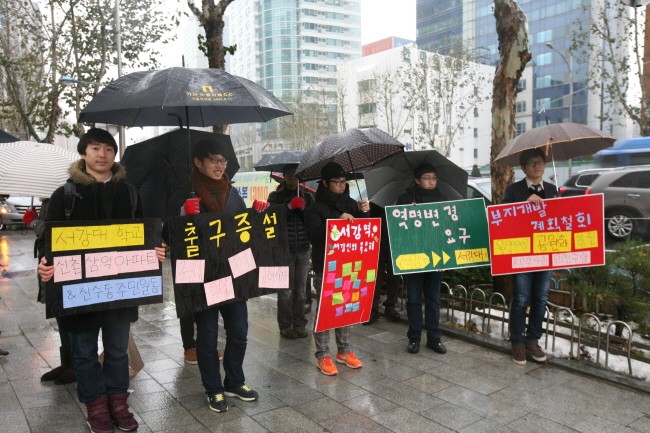한편 동문과 재학생, 모교 교직원, 신수동 주민 등이 참여하고 있는 '서강역대책위원회'는 2012년 12월 14일 공덕역에서 열린 경의선 개통식장 앞에서 서강역 명칭 변경을 요구하는 집회를 연 바 있습니다(위 사진).