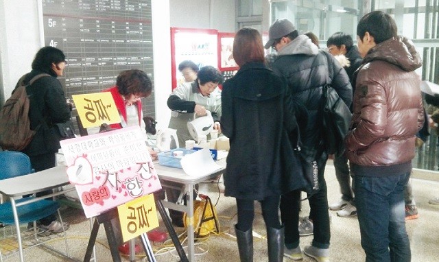 모교 환경미화를 담당하는 여성 청소용역 근로자들이 12월 4일 차 나눔 행사를 열었습니다. 이날 행사에 참가한 근로자들은 오전 8시 30분부터 11시까지 2시간 30분 동안 교내 9개 건물로비에서 재학생에게 따뜻한 차를 건넸습니다. 행사를 주관한 박갑순 씨는 “날씨가 유난히 추웠지만 그만큼 따뜻한 차를 들고 가는 학생들을 보니 흐뭇했다”라고 말했습니다.