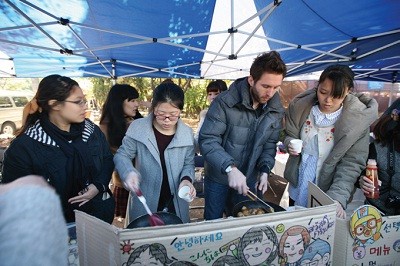 모교 한국어교육원(원장 74 정외 허구생)이 주최한 제6회 세계인의 축제 ‘사람, 사랑’이 11월 2일 낮 11시부터 오후 3시까지 청년광장에서 열렸다. 한국어를 배우기 위해 전 세계에서 찾아 온 학생들이 우리나라 전통 혼례 및 봉산탈춤 공연을 시연하고 줄다리기와 투호 놀이를 하며 즐기는 가운데 각자 자국 음식을 만들어 시식했다. 최근 전 세계를 강타중인 한류음악 ‘강남 스타일’이 울려 퍼지는 가운데 외국인들의 못 말리는 한국사랑은 곳곳에서 드러났다. 참석자들은 국적에 따라 중국식 고기햄버거와 닭 요리, 태국 월남쌈과 스프처럼 생긴 팍텅갱부앗, 스페인식 상그리아와 폴보론 과자, 프랑스 민속요리 크레이프, 일본식 야키도리와 버터 감자, 이탈리아식 핫초코 등을 즉석에서 조리했다. 능숙한 한국어로 “맛있으니 먹고 가세요”라고 호객한 덕분인지 대부분 음식장터는 재료가 일찌감치 떨어져 매진 사례를이뤘다.