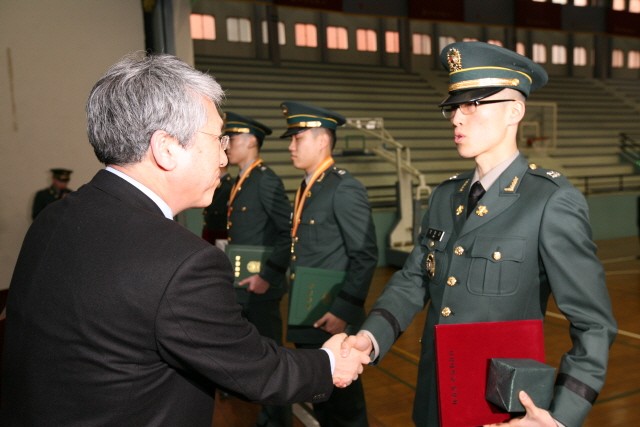 그러하기 위해서는 “인문학적 지식과 교양을 쌓아야 하는 만큼 책을 가까이 해서 지덕체(智德體)로 무장한 군인으로 발전하길 희망한다”고 덧붙였습니다. 이어 우수한 성적으로 졸업하는 오장근 사관후보생에게 상장 수여하고, 부상으로 준비한 시계를 선물했습니다.
