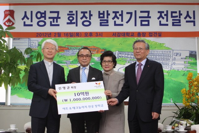 신 회장은 “우리나라 젊은이들의 멋과 끼가 한류라는 이름으로 세계무대에서 열광적인 환영을 받는 가운데 국내 최초로 서강대학교에 설립되는 아트 앤 테크놀로지 학과에서 좋은 인재를 양성하여 문화예술을 더욱 발전시키길 바란다”며 장학기부의 뜻을 전했습니다. 신 회장의 부인 김선희 씨는 “나눔, 사랑, 배려에 관심이 많은 남편의 모습이 기쁘고 자랑스럽고, 힘닿는 데까지 건강한 모습으로 다른 사람들에게 많이 베풀며 살았으면 하는 바람”이라고 말했습니다.