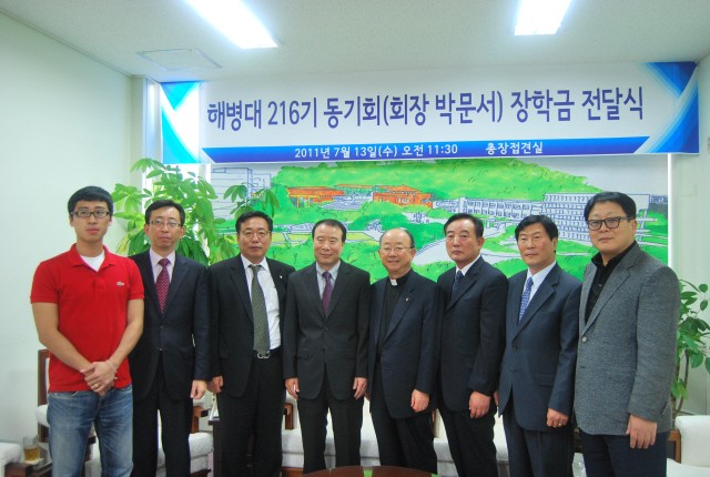 해병대 216기 동기회가 모교에 1억 원을 장학기금으로 기탁했습니다. 7월 13일 오전 11시 30분 총장실에서 진행된 장학기금 전달식에서 박문서 해병대 216기 동기회장은 앞으로 5년간 총 1억 원을 기탁하기로 하고, 그 시작으로 1000만원을 모교에 전달했습니다. 기탁된 장학기금은 해병대 출신 재학생을 돕는 장학금으로 쓰일 예정입니다.