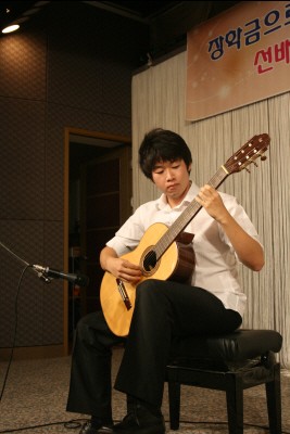<처음으로 시도한 장학생들의 연주와 노래. 영화 <원스>의 주제곡 ‘Falling Slowly’를 클래식 기타로 연주하고 멋진 화음으로 부르는 김성준(03 전자), 김형민(04 화공), 이동헌(03 컴퓨터) 장학생.(사진 왼쪽부터)>