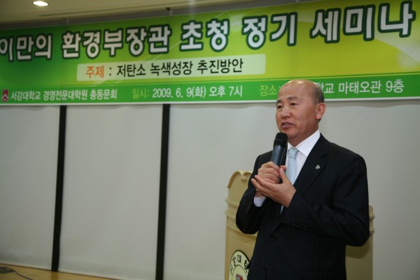 이 장관은 강연에서 지구의 환경문제와 에너지ㆍ자원문제, 그리고 이로 인한 피해의 심각성을 설명했다. 그리고 이를 슬기롭게 극복하면서 지속가능한 발전을 실현하기 위해서는 ‘저탄소 녹색성장’이 필수라고 강조했다. 이 장관은 ‘저탄소 녹색성장’을 “온실가스와 환경오염을 줄이는 지속가능한 성장이며, 녹색기술과 청정에너지로 새로운 성장 동력과 일자리를 창출하는 새로운 국가발전 패러다임”으로 정의했다. 그리고 이를 실현하기 위해서는 경제ㆍ사회 구조의 변화는 물론, 우리의 사고방식과 생활양식에까지 포괄적인 변화가 필요하다고 강조했다.
