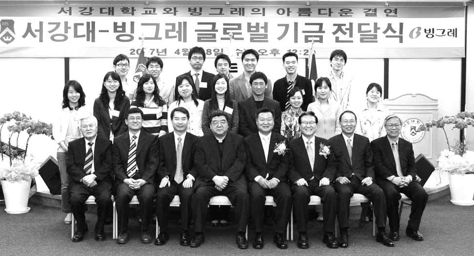 ‘서강대-빙그레 글로벌 기금’협약식 및 장학증서 수여식이 개교기념일인 지난 4월 18일 모교 마태오관 9층에서 열렸다. ‘서강대-빙그레 글로벌 기금’은 김호연 동문 회장(빙그레 회장)이 모교 후배들을 국제적인 인재로 양성하고자 출연한 기금으로 마련되었다. 손병두 총장은“어려운 경제상황에도 불구하고 장학금을 쾌척해 준 빙그레 김호연 회장에게 감사드린다. 이 기금은 글로벌 인재양성을 위해 소중히 사용하겠다”며 감사의 인사를 전했다. 이날 빙그레를 대표하여 협약식에 참석한 정수용 빙그레 사장은“서강대가 추구하는 인류문화 발전에 공헌하는 인재상은 빙그레의 인재상과도 일치한다”며“장학생들이 보다 넓은 세상에 나가 자신들의 창조, 열정, 도전정신을 마음껏 실험하길 바란다”고 장학생들을 격려했다.