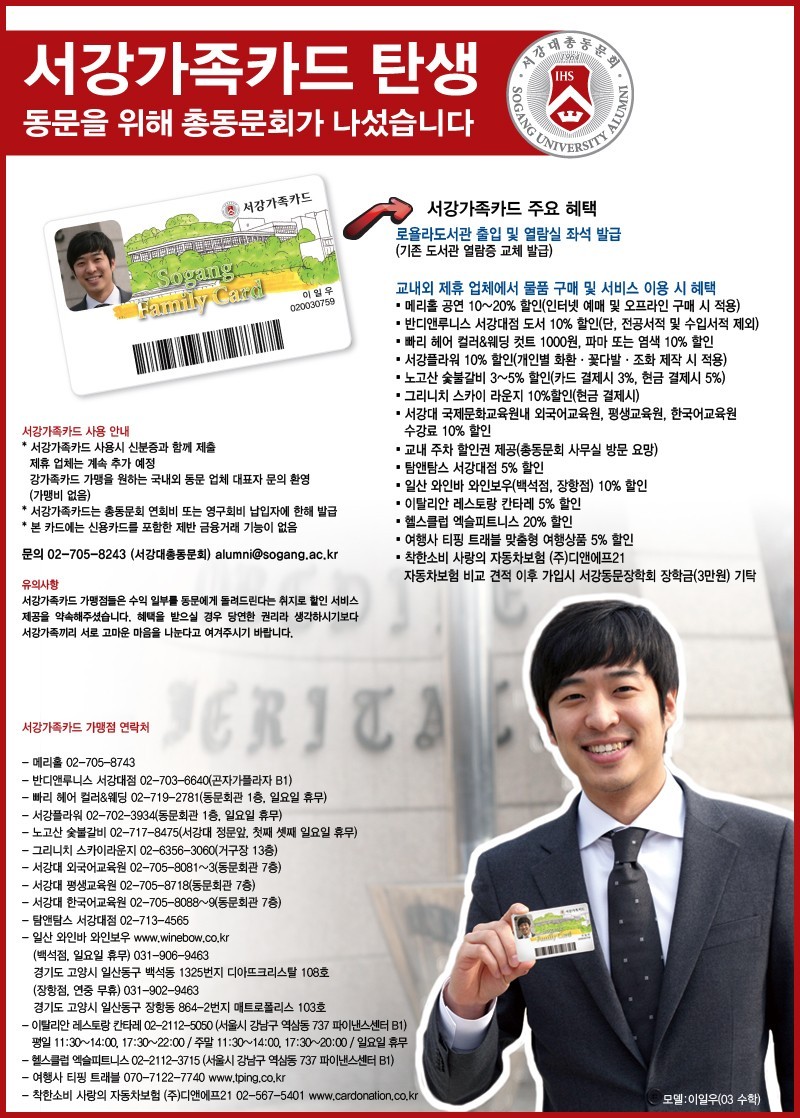 수익 일부를 동문에게 돌려드린다는 취지로 할인 서비스 제공을 약속해주셨습니다. 혜택을 받으실 경우 당연한 권리라 생각하시기보다 서강가족끼리 서로
