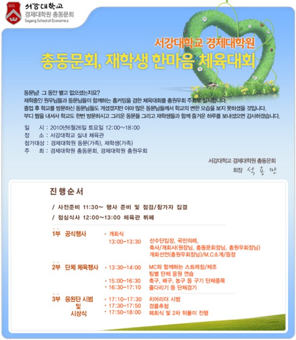 경제대학원 동문회 주최 '한마음 체육대회' 페이지 정보 작성자 관리자 작성일10-06-14 13:34 조회18,384회 댓글0건 관련링크 프린트 목록 본문 경제대학원 동문회에서 주최하는 '한마음 체육대회' 안내입니다. 댓글목록 등록된 댓글이 없습니다. 프린트 목록