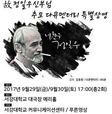 김동원(74 신방) 동문이 연출한 故정일우 신부 추모 다큐멘터리 '내친구 정일우' 특별 상영회가 9월 29일, 30일 오후 5시 모교 메리홀 대극장에서 열립니다. 동문 여러분의 많은 참여 부탁드립니다.