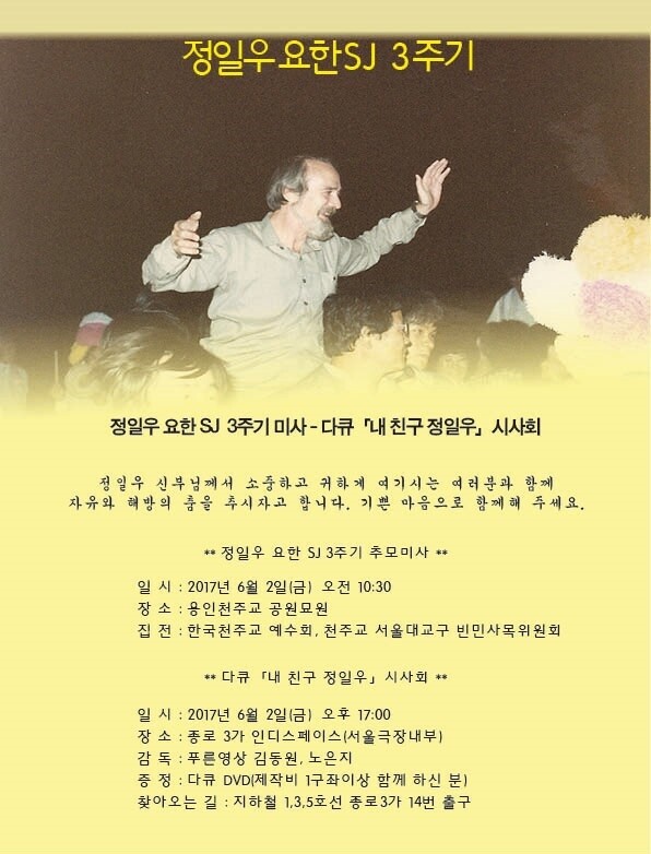 故정일우(존 V. 데일리) 요한 SJ 신부 3주기 추모미사가 6월 2일 오전 10시 30분 용인천주교 공원묘원에서 열립니다. 더불어 같은 날 오후 5시 부터는 종로 3가 서울극장 내 인디스페이스에서 김동원(74 신방) 동문이 감독한 다큐멘터리 '내 친구 정일우' 시사회가 열립니다.